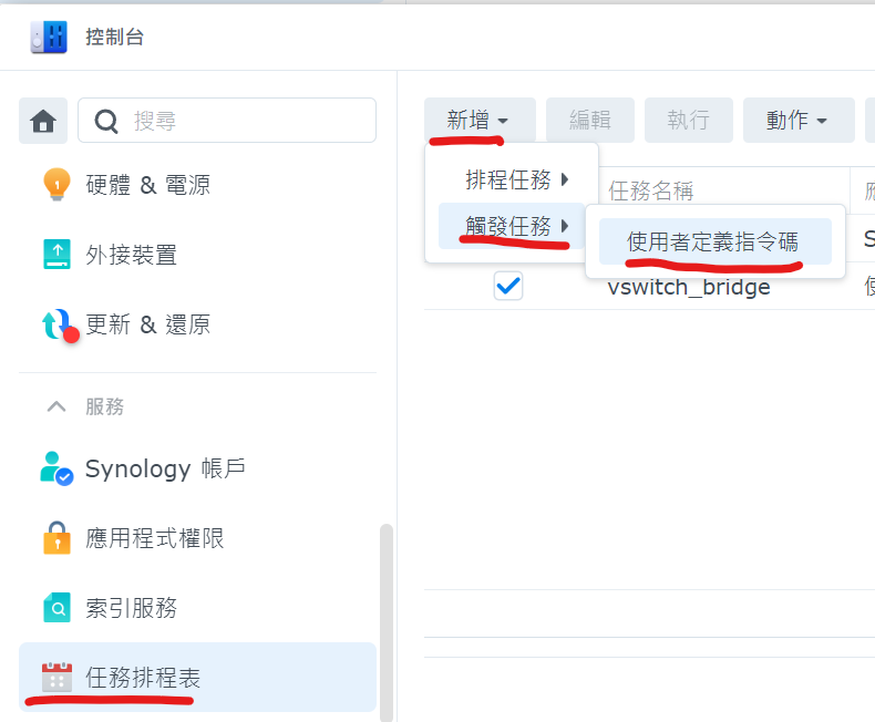 利用2的方法, 把它的腳本抓下來 (vswitch_bridge.sh), 接著再去NAS後台設定的任務排程